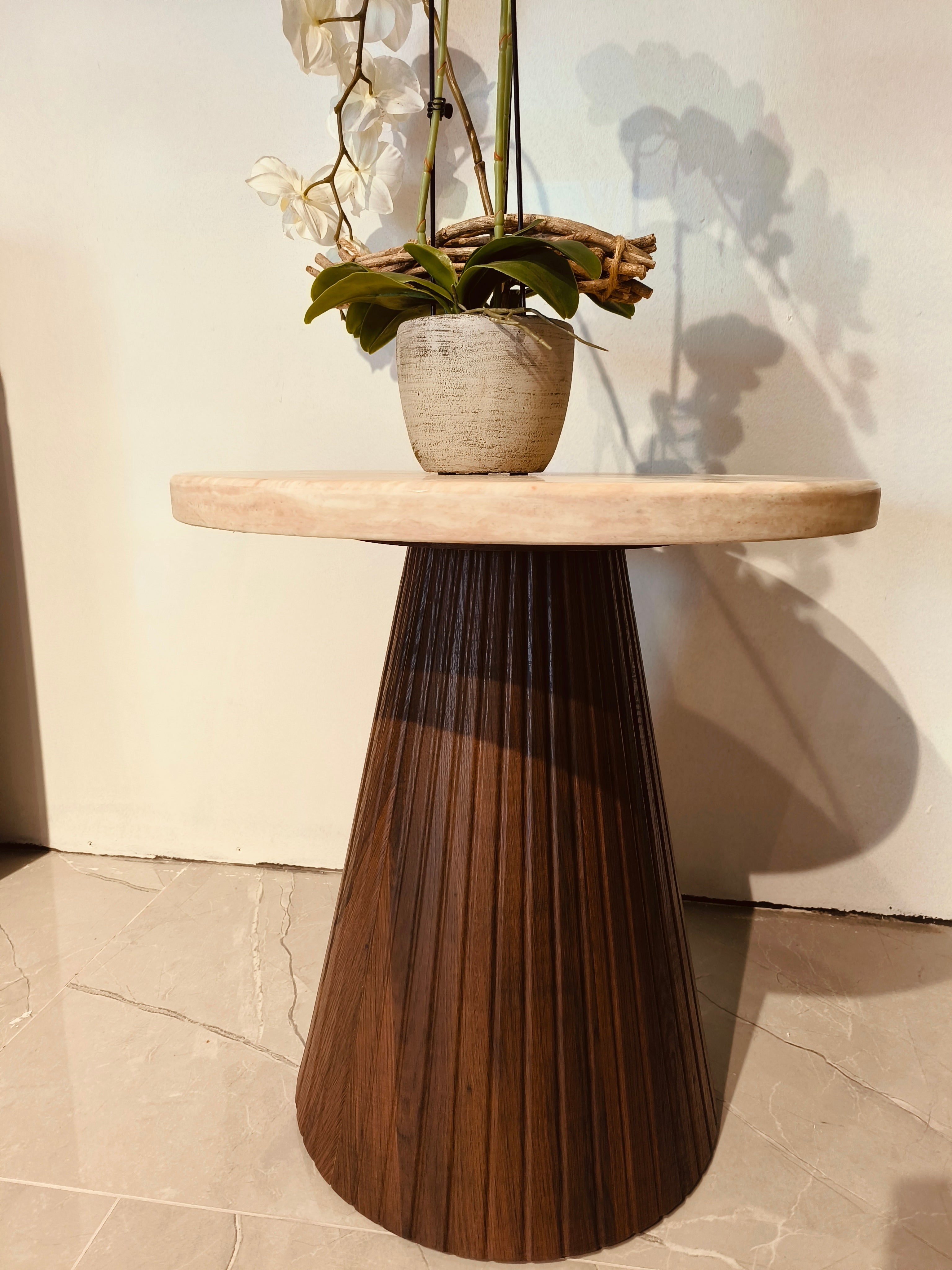 De Nordic Empire bijzettafel is een stijlvol en functioneel meubelstuk dat elke ruimte een moderne uitstraling geeft. Met een diameter van 55 cm en een elegant ontwerp, is deze bijzettafel perfect voor zowel kleine als grote woonruimtes. De tafel heeft een warme bruin tint die een gezellige sfeer creëert en combineren prachtig met diverse interieurstijlen.