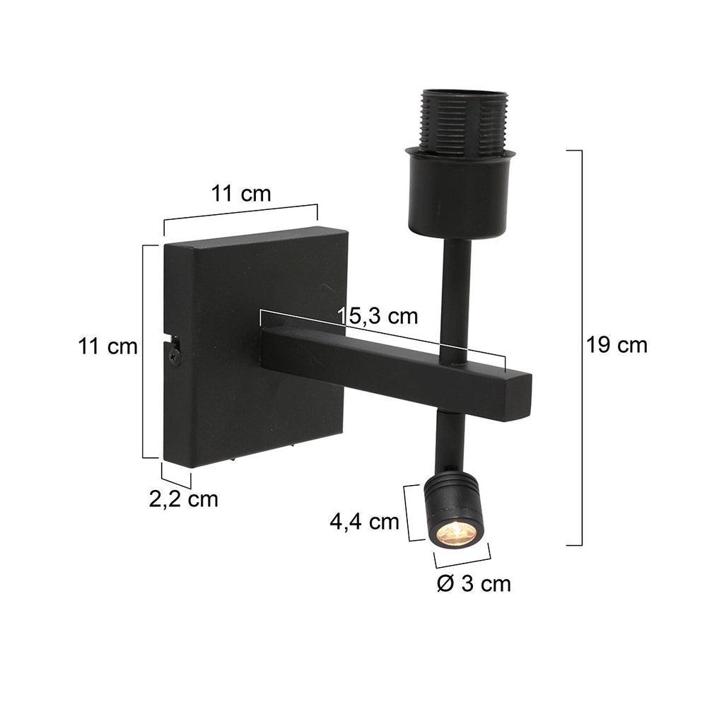 Wandlamp uit de Stang serie. De wandlamp is vervaardigd uit metaal en voorzien van een zwarte coating. Voorzien van een E27 (grote) fitting en geschikt voor lichtbronnen tot 40 Watt. De Stang wandlamp heeft ook een apart leeslampje van 1 Watt met  2900 Kelvin en 100 Lumen. Beide lampen zijn afzonderlijk van elkaar te bedienen, onder aan de wandplaat zitten 2 aan/uit schakelaars. De lamp dient rechtstreeks aangesloten te worden op het netwerk. De wandplaat is 11 centimeter hoog en breed. Totale hoogte is 19 centimeter. Bestel de 2995ZW wandlamp nu online met de service en garantie van een servicepunt bij u in de buurt.
